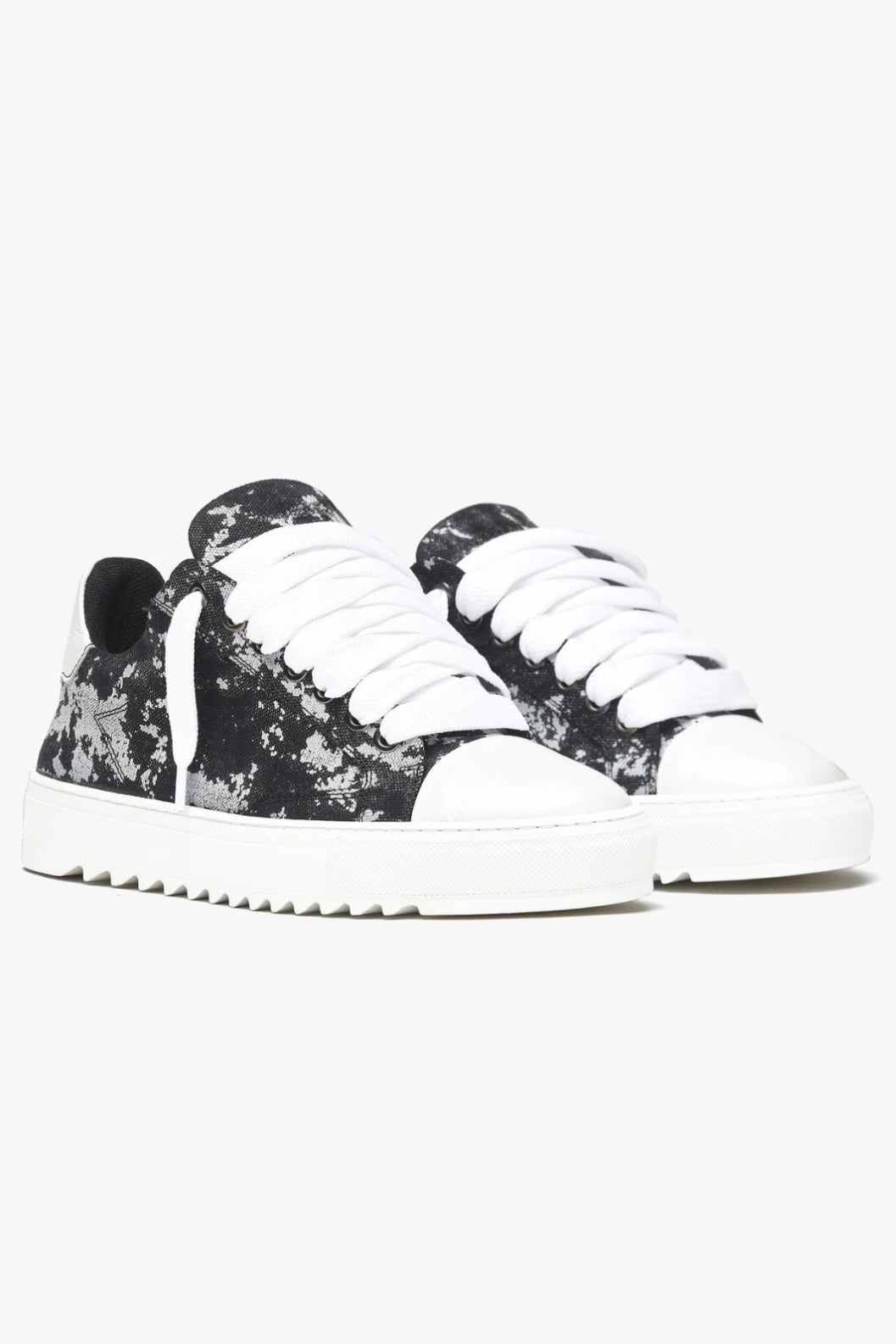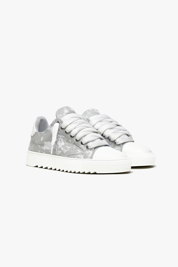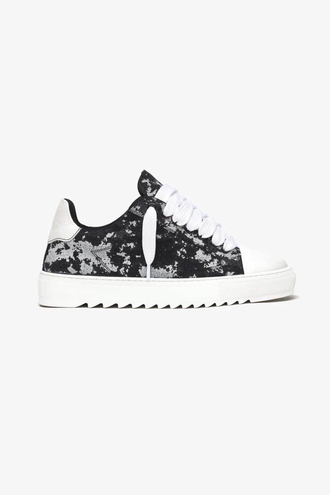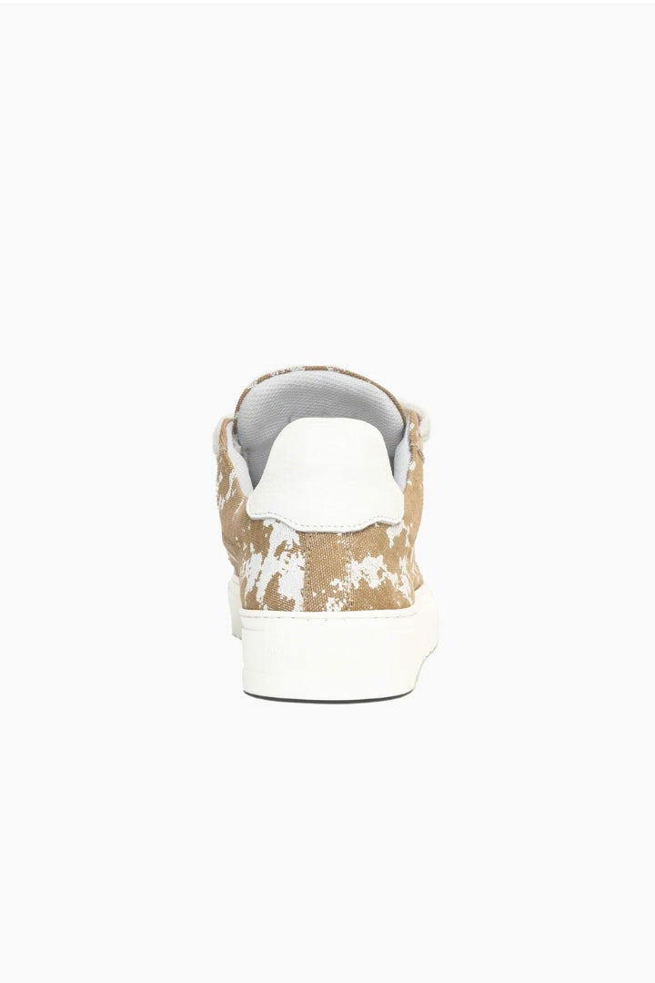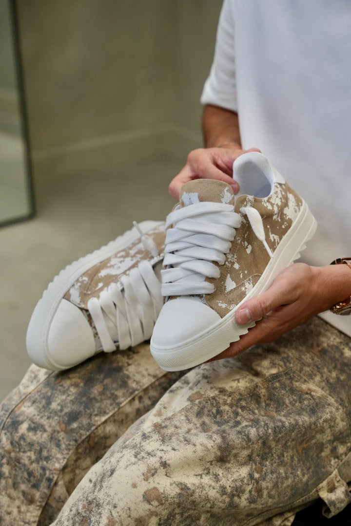 Elaborados con meticulosa atención al detalle, la parte superior de lona teñida a mano a medida asegura que cada par sea una obra de arte única, ya que no hay dos pares que tengan el mismo patrón. Complementando esta característica distintiva está la firma de la puntera de cuero texturizado blanco nítido, que añade un toque de sofisticación al diseño.